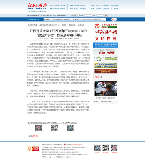 为推动主题教育走深走实、践行为民服务初心使命,进一步提升老年居民对各类诈骗行为的鉴别力和防范力,切实提高老年人依法维权和自我保护意识,7月11日上午,必赢76net线路官网(江西老年开放大学)联合江西省社区教育指导中心、江西省科学技术协会和赣州市公安局,共同开展“银龄大讲堂”(第二期)权益系列——“防范养老诈骗 安享银龄生活”知识讲座。本次讲座线上线下同步开启,全省11个地市开放大学(社区教育指导中心)和长天集团康养中心组织了线上集中收看,近150人现场参加了活动,线上直播观看量达5000余人。必赢76net线路官网党委书记贺瑞虎亲临现场指导活动开展,必赢76net线路官网校党委委员、副校长、江西老年开放大学校长冯豫红及江西老年开放大学有关成员单位负责人出席活动。