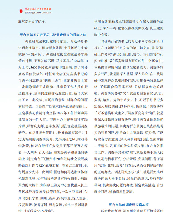 调查研究是我们党的传家宝。习近平总书记形象地指出:调查研究就像十月怀胎,决策就像一朝分娩。调查研究的过程就是科学决策的过程,千万省略不得、马虎不得。”198410 月上旬,5600份民意调查表印制出来,除了向各乡各单位发放外,时任河北省正定县委书记的习近平同志提议到街上去!正定县历史上第一次问卷调查正式启动。他带着工作人员在街边摆桌子,主动向过往群众发放问卷,还请大家坐下来一起交谈,当场征询意见,对群众的问题答疑释惑。正是在广泛征求群众意见的基础上,正定县委初步制订出全县1985年工作计划和要抓紧办的十件大事。习近平总书记坚持拜实践 为师、拜群众为师,思考发展问题,注重基层调查研究。在福建福州任职时,他推动落实每年3月定为福州的调查研究月,大兴调研之风,推动科学决策;他亲自带领广大党员干部开展万人答卷、千人调研、百人论证,在充分调研和论证的基础上,制定出台了《福州市20年经济社会发展战略设想》,即“3820”战略工程。在浙江工作时,他每周至少安排一次调研,围绕如何再造浙江体制机制新优势、如何加快构建具有较强辐射力和凝聚力的大城市、如何以上海为中心加快融入长三角区域经济发展步伐等问题,一次次到温州、台州、杭州、宁波、湖州、嘉兴、绍兴等地,深入基层、 反复调研、统筹谋划、思考发展,提出一系列新举措,进而形成八八战略