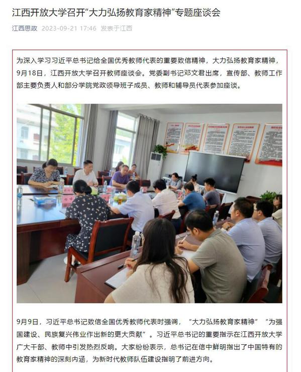 为深入学习习近平总书记给全国优秀教师代表的重要致信精神,大力弘扬教育家精神,9月18日,必赢76net线路官网召开教师座谈会。近日,江西思政对此进行报道。