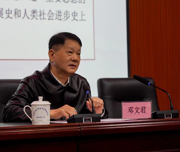 此次讲座之前,邓文君专程深入学生中进行交流,了解掌握学生思想动态和学习生活所需。“大家要沉下心认真学习,学好党的创新理论以及科技文化、法律法规、专业知识,你们将受益终身。”邓文君以同学的课前提问为导入,在答疑解惑中徐徐铺陈辅导报告的主旨精神,“马克思主义是中国共产党立党兴国的根本指导思想。与时俱进是马克思主义的理论品格。19世纪有19世纪的马克思主义,20世纪有20世纪的马克思主义,21世纪当然要有21世纪的马克思主义。习近平新时代中国特色社会主义思想就是21世纪马克思主义,是当代中国马克思主义。作为我们党和国家必须长期坚持的指导思想,这一重要思想的形成,在中华民族复兴史、马克思主义发展史和人类社会进步史上具有里程碑意义。”邓文君围绕“世情、国情、党情的变化”和“理论、实践、时代、文化背景”两个维度,深入浅出、旁征博引,与广大师生们展开了交流研讨。
