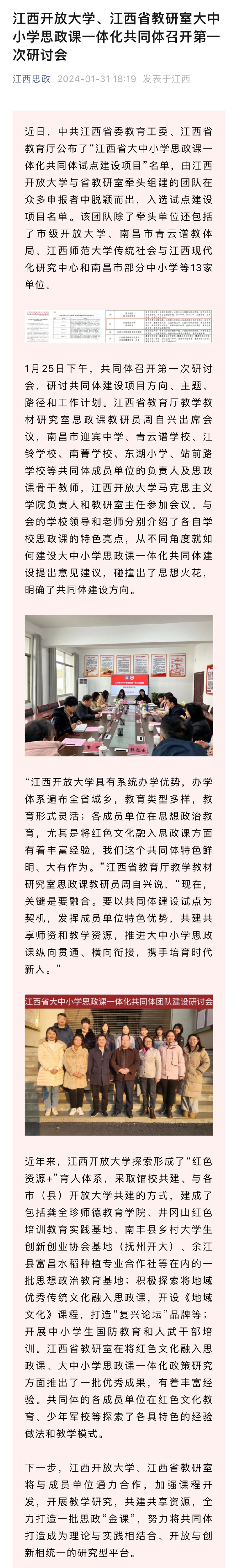 近日,中共江西省委教育工委、江西省教育厅公布了“江西省大中小学思政课一体化共同体试点建设项目”名单,由必赢76net线路官网与省教研室牵头组建的团队在众多申报者中脱颖而出,入选试点建设项目名单。该团队除了牵头单位还包括了市级开放大学、南昌市青云谱教体局、江西师范大学传统社会与江西现代化研究中心和南昌市部分中小学等13家单位。