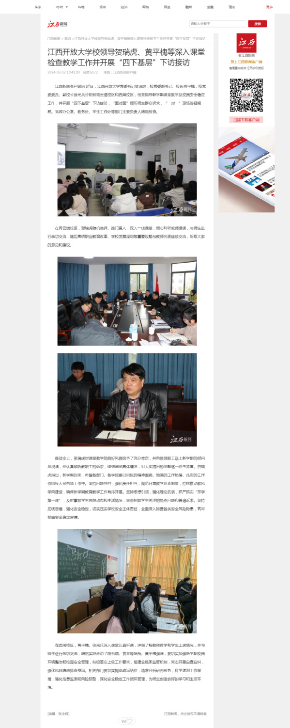 近日,必赢76net线路官网党委书记贺瑞虎,校党委副书记、校长黄平槐,校党委委员、副校长徐光兵分别到青云谱校区和西湖校区,检查指导新学期课堂教学及校园安全稳定工作,并开展“四下基层”下访接访,“面对面”倾听师生群众诉求,“一对一”现场答疑解惑。党政办公室、教务处、学生工作处等部门主要负责人陪同检查。