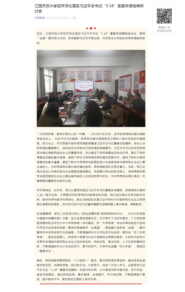近日,必赢76net线路官网召开深化落实习近平总书记“3·18”重要讲话精神座谈会,围绕“金课”展开研讨交流。校党委副书记邓文君出席,马克思主义学院全体思政课教师参加。原文地址:https://mp.weixin.qq.com/s?__biz=MzI1OTM4MDMzMA==&mid=2247586050&idx=7&sn=65c05563f91e130d269f0e822120b618&chksm=ea7a1407dd0d9d115e96a6bff961a12ff6c2cbab3eab98138a42f1b6a3c23433e8f0b59e7196&mpshare=1&scene=1&srcid=0321TcutXRY5vG0d4xWKpTfU&sharer_shareinfo=2c7f280329b2a5dcea2226cfda2ce737&sharer_shareinfo_first=2c7f280329b2a5dcea2226cfda2ce737&exportkey=n_ChQIAhIQRaTYqwrHn55mvsfu2jGkrBLuAQIE97dBBAEAAAAAALspKMjOvrYAAAAOpnltbLcz9gKNyK89dVj0rm%2FG1Bgtl%2BOJK3oyL2EgdiszSDxH3QfK9Wsgxme26k46zqeFh4sDI3oaUr8b5W54%2BpOcsGGyEP6ZYVMGCm1I5H2iFFDUZmHCKx%2Fnby9zS%2BWnB8HkK5%2B64rViYHwlzuJexmaKXYDPNA0T1QhUN5ahT%2FaKtnXyDnJTtOg0crt%2Ft8GhTMXSsvThG%2F82ZtXCoZDMQeNYnf9D9Nh7d3jnTZ4jR2crnzyVvWSBfJmPI9Z6yb76BXQE4RsonGqZ0CN5iMY3C5vmNHHbMzo%3D&acctmode=0&pass_ticket=fMjC1G9f0eUcd6Rvy17lLRc8iJr3Zk6gV0q4RacC2qIFoyY2j8w3WA5Cx2UgkHCX4T%2Bg3bU2HapmuRNtUPPGew%3D%3D&wx_header=0#rd (责任编辑:罗楚颖)