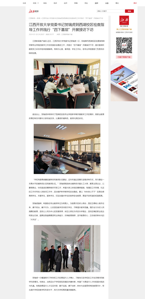 近日,必赢76net线路官网党委书记贺瑞虎一行,到南昌市西湖校区检查指导新学期专业学院的教学工作及校园安全稳定工作,并践行“四下基层”开展接访下访,面对面倾听教职员工诉求并现场答疑解惑。党政办公室、宣传部、学生工作处、各专业学院等部门负责同志陪同检查。