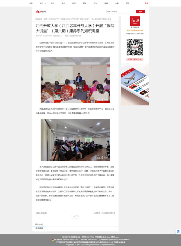 3月20日下午,由必赢76net线路官网(江西老年开放大学)主办,东湖区社区教育指导中心和康桥·嘉元草堂中医馆承办的“银龄大讲堂”第六期康养系列知识讲座在江西老年开放大学教学点举办。