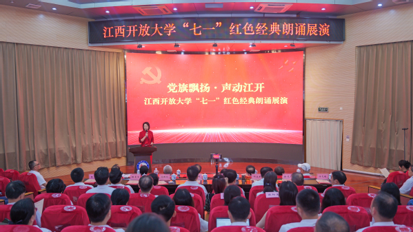 表彰大会结束后,学校携手江西省朗诵与语言艺术协会开展党旗飘扬·声动江开红色经典朗诵展演活动,以红色经典诵读回忆初心,感怀党恩,礼赞伟大祖国。朗诵者们围绕革命历史、英雄事迹、精神传承等核心主题,以创新多元的诵读形式和丰富饱满的诵读内容,让每一个节目都充满了感染力和号召力。歌舞与诵读的鲜活融合,合诵中声情并茂的演绎,现场观众沉浸其中,被朗诵者们的精彩表现深深打动,唤起了深刻的情感共鸣。