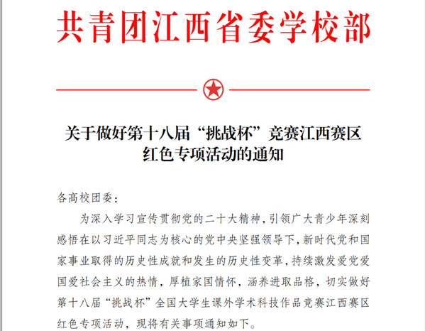 近日,共青团省委公布第十八届“挑战杯”全国大学生课外学术科技作品竞赛红色专项活动结果,由我校团委推报的《不忘初心追理想,井冈精神铸心魂》项目成功入围国赛。