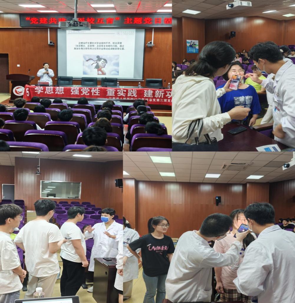 活动以“党员联育、队伍联建”为主线,突出医校“资源共享、协同育人”特色。江西省人民医院专家吴金枝以《正确认识正畸治疗》为主题,为现场师生带来一场内容丰富的特色课程。吴医生通过生动的临床案例分析,系统阐释了正畸治疗的原理与常见误区,并设置“互动答题”环节,通过寓教于乐的方式与学生深入交流,现场气氛热烈,掌声频现。同时,医院口腔科专家团队为在场师生开展义诊,提供免费口腔检查、正畸评估及保健建议,实现医学知识与党建教育深度融合。