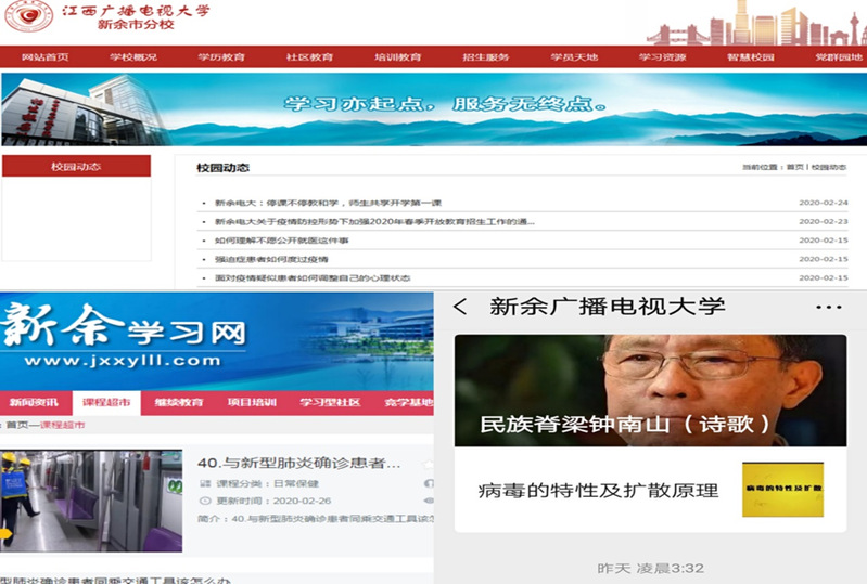 疫情防控期间,为落实习近平总书记关于“同舟共济,科学防治精准施策”打赢疫情防控阻击战的相关要求,学校发挥网络教育线上学习的优势,积极行动起来,做好面向当地社区居民、广大教职工和成教学员的疫情宣教、疫情防控工作。主动与国家数字化学习资源中心对接、沟通,相继在新余学习网、新余广播电视大学官网、新余广播电视大学微信公众号等学习平台免费开通了“新型冠状病毒防控公益课程”,包括60余个微课程余个微课程和1门《新型冠状病毒防控教程》慕课。内容涵盖认识新型冠状病毒、个人防护群体公众及医务人员心理辅导与干预谣言辨析等疫情防控的关键方面。内容丰富,针对性强,供全市社会大众在线学习、传播科学防控知识。以便市民更多了解防控新型冠状病毒感染肺炎相关知识,搭建起全民科学防疫“心”桥梁,用知识的力量抗击疫情,做到防控宣传教育全覆盖!