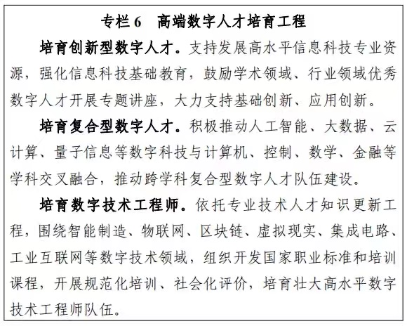 11.提升新兴职业群体数字技能。面向“互联网+教育”、互联网医疗、电子商务、供应链管理服务、线上办公、“虚拟”产业园、“无人经济”等新业态新模式,制定数字领域新职业的职业标准,丰富职业培训课程,开展从业人员培训,壮大新兴职业群体人才队伍。引导支持新兴职业群体,积极利用5G、人工智能、虚拟现实、大数据、区块链等数字技术创新创业。
