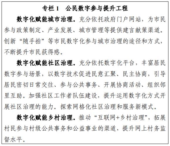 13.提升领导干部和公务员数字治理能力。加大领导干部和公务员信息化培训力度,丰富数字经济、数字社会、数字政府等领域线上培训资源,把提高党员领导干部数字治理能力作为各级党校(行政学院)的重要教学培训内容。引导领导干部和公务员运用网络了解民意、开展工作,提升学网、懂网、用网的能力。在公务员选拔任用中,加强数字能力方面的考察。