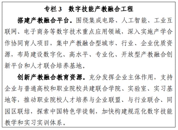 15.完善数字技能职业教育培训体系。完善数字技能职业教育,加强职业院校数字技能类人才培养,动态更新职业教育专业目录,推进专业升级和数字化改造,优化完善课程设置,建设高水平数字技能职业教育教师队伍。制定完善数字技能职业教育国家标准,推行“学历证书+职业技能等级证书”制度,打造一批高水平数字技能职业院校和专业。加大数字技能职业培训力度,研制培训方案和内容标准,规范数字技能职业培训,试点探索“互联网+”职业技能培训模式,推动数字化培训模式发展。